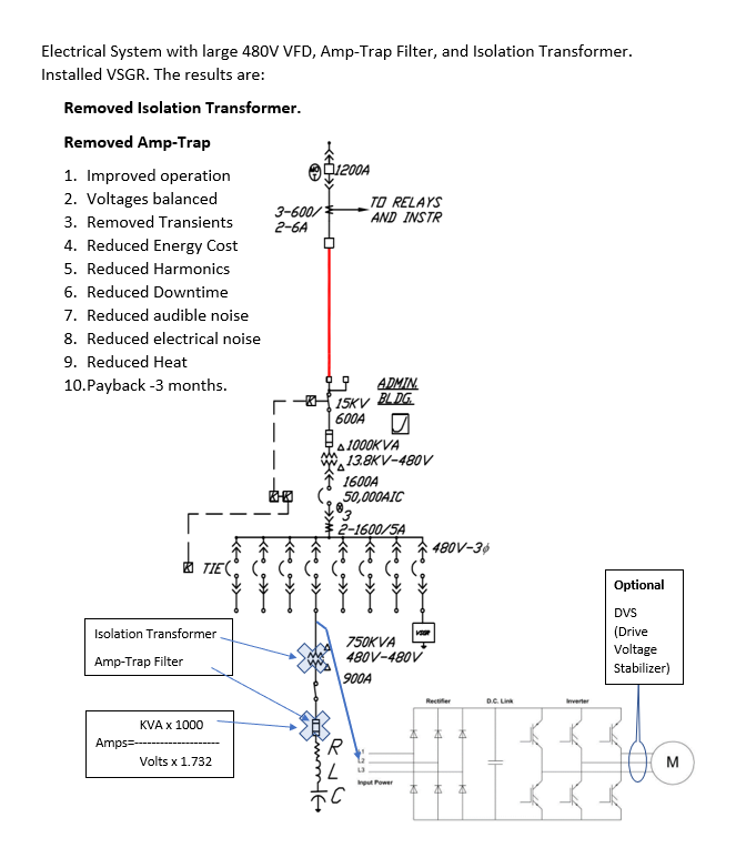 I learned that this motor is actually a DC motor and the drive is SCR system. (for SCR a DVS, drive voltage stabilizer, does not apply, as the motor is DC). The Harmonics can be extreme in either case, depending on a number of factors. The good news is that applying VSGR is simple. VSGR is sized to the Supply Transformer. On a 3 wire system, the Harmonics will be reduced by about 85%. The same system would be used for SCR or VFD.